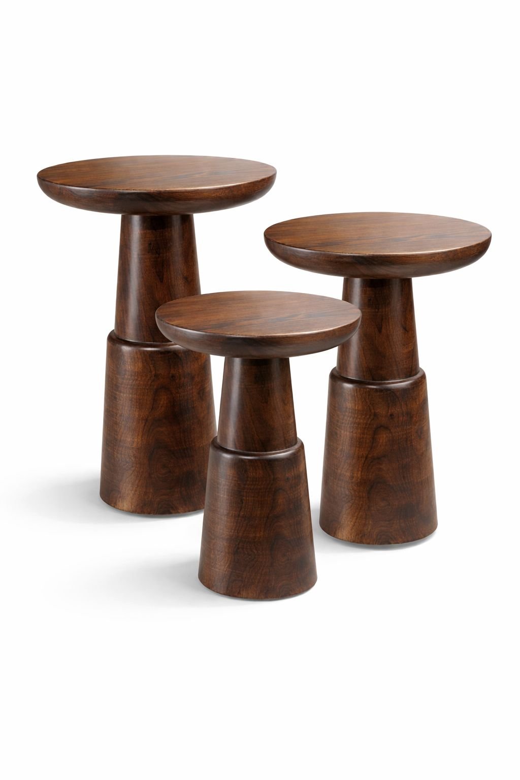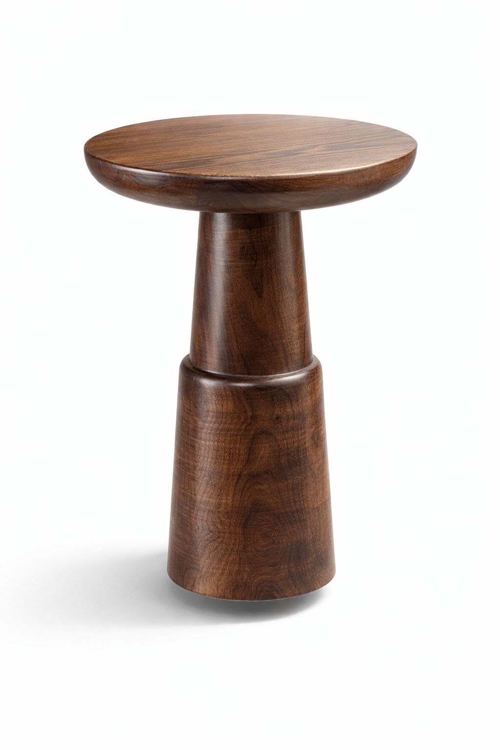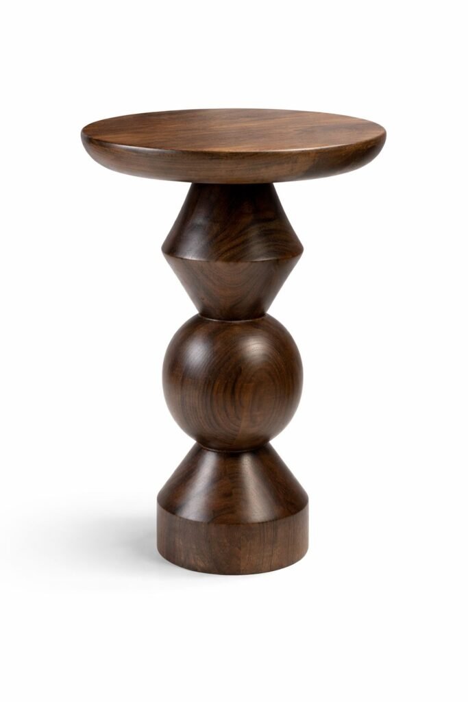 Sculptural Yan Sehpa, masif doğal ahşaptan üretilmiş, heykelsi formu ve dengeli oranlarıyla mekânda güçlü bir duruş sergileyen özel bir tasarımdır.